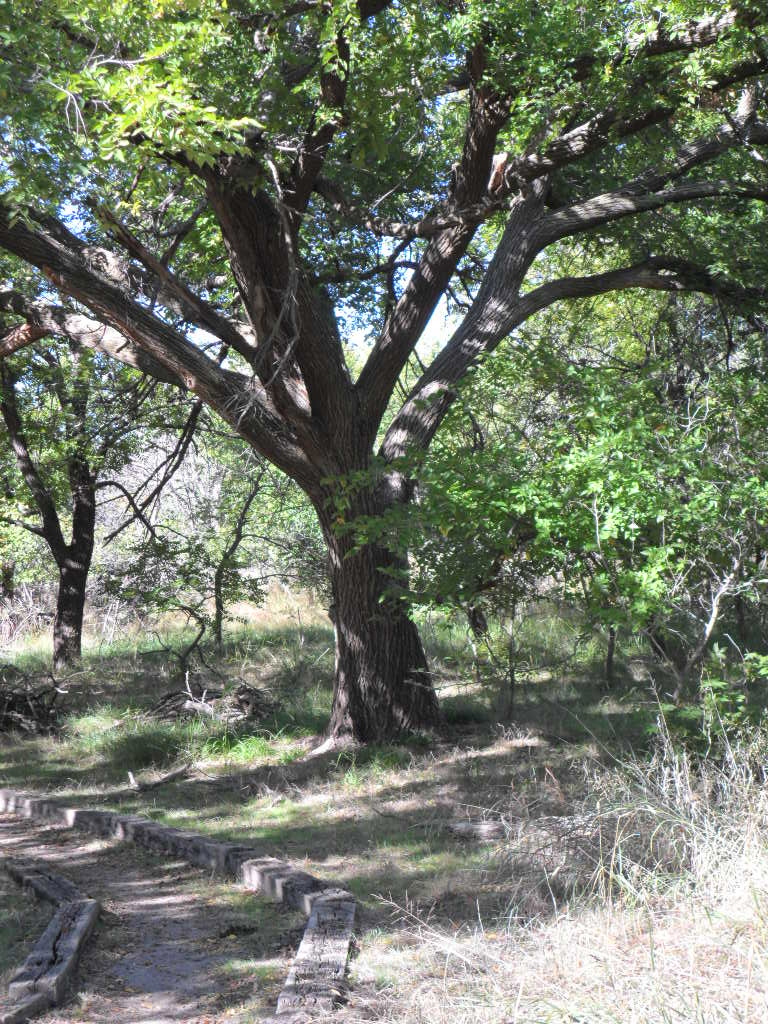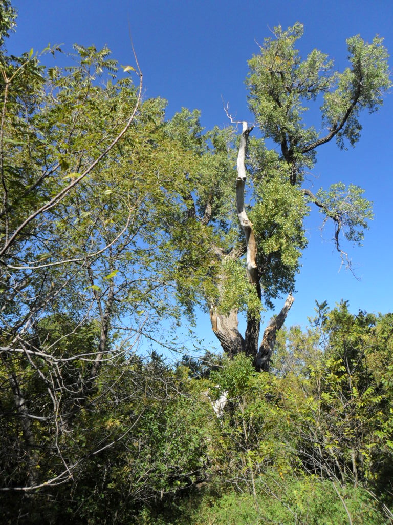 We took off from the main trail especially to come to this cottonwood tree, one of the oldest, if not the oldest, in the Panhandle. Over a hundred years ago this tree stood as the sentinel for the overland trail that went through this area.  The military, ranchers, and Native Americans all used the trail across this area of the plains.  The tree’s height enabled it to be seen for miles and helped travelers keep on their way with accuracy.  Once we reached the end of the main trail, some of the group took off in their vehicles while a few went on around the lake.  It saddened me to see so much of it dried up and old tires sticking out of the dried mud.  However, along the way, we saw numerous trees I could not identify.  The bark of this tree is particularly distinctive.