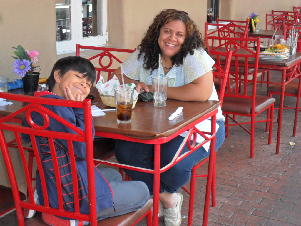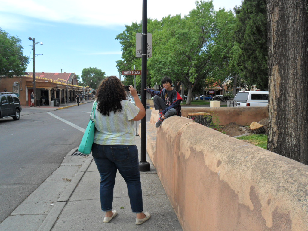 No rushing around this morning. We wanted to stop by Old Towne, stroll around, and have lunch. We doubted shops would open before ten. After all the rain, everything sparkled in the morning sun. We found a parking space–often extremely difficult to find there–on the west side of the church by the square and headed east in front of the church. Because it was early or because of the rain earlier, it seemed much less hectic than usual. We chatted with shop keepers, bargained, wandered. My grandson announced he was very hungry so we sat outside at the Hacienda (I think that is the name of the restaurant we go to near the square–we just go and never pay attention to its name). All I wanted was fry bread. First, I dipped it in the salsa then switched to honey. After this relaxing leisurely lunch, we finished our walk around the square and headed to Astro Zombie in Nob Hill. I think my grandson could go there every day.
