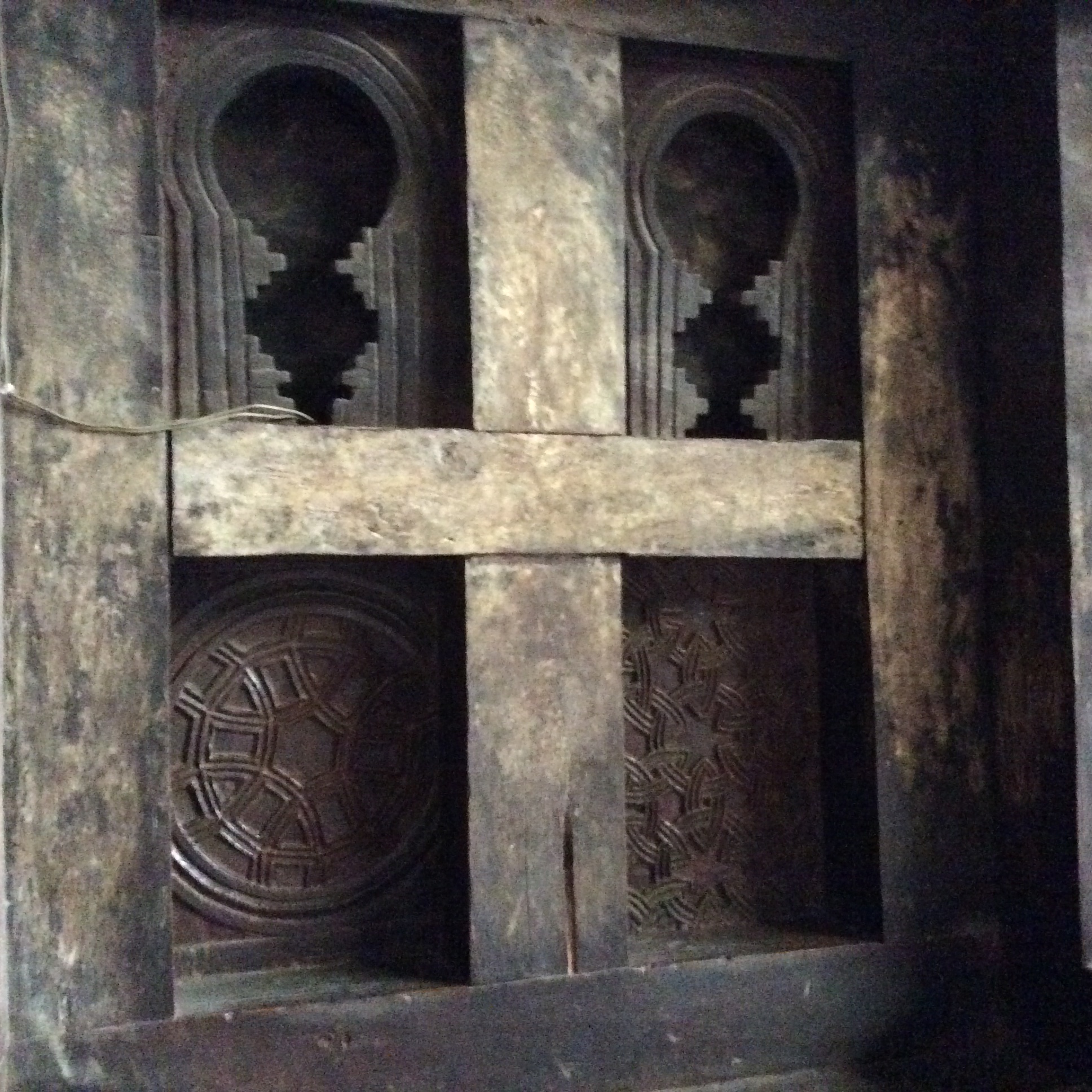 Like all these churches, this one, Bet Emanuel, was carved and dug out of solid rock and is built so that the top is level with the slope of the land.  Thus, it is purposefully nearly invisible unless you are quite close to it.  To get to the bottom and go inside you have to climb down rather steep steps. Built in the Auxumite style (Auxum was the original “capital” of the Ethiopian Orthodox Church), some art historians consider it to be the most impressive church in Lalibela.  It is 18 meters by 18 by 12 (58.5 feet by 58.5 by 39).