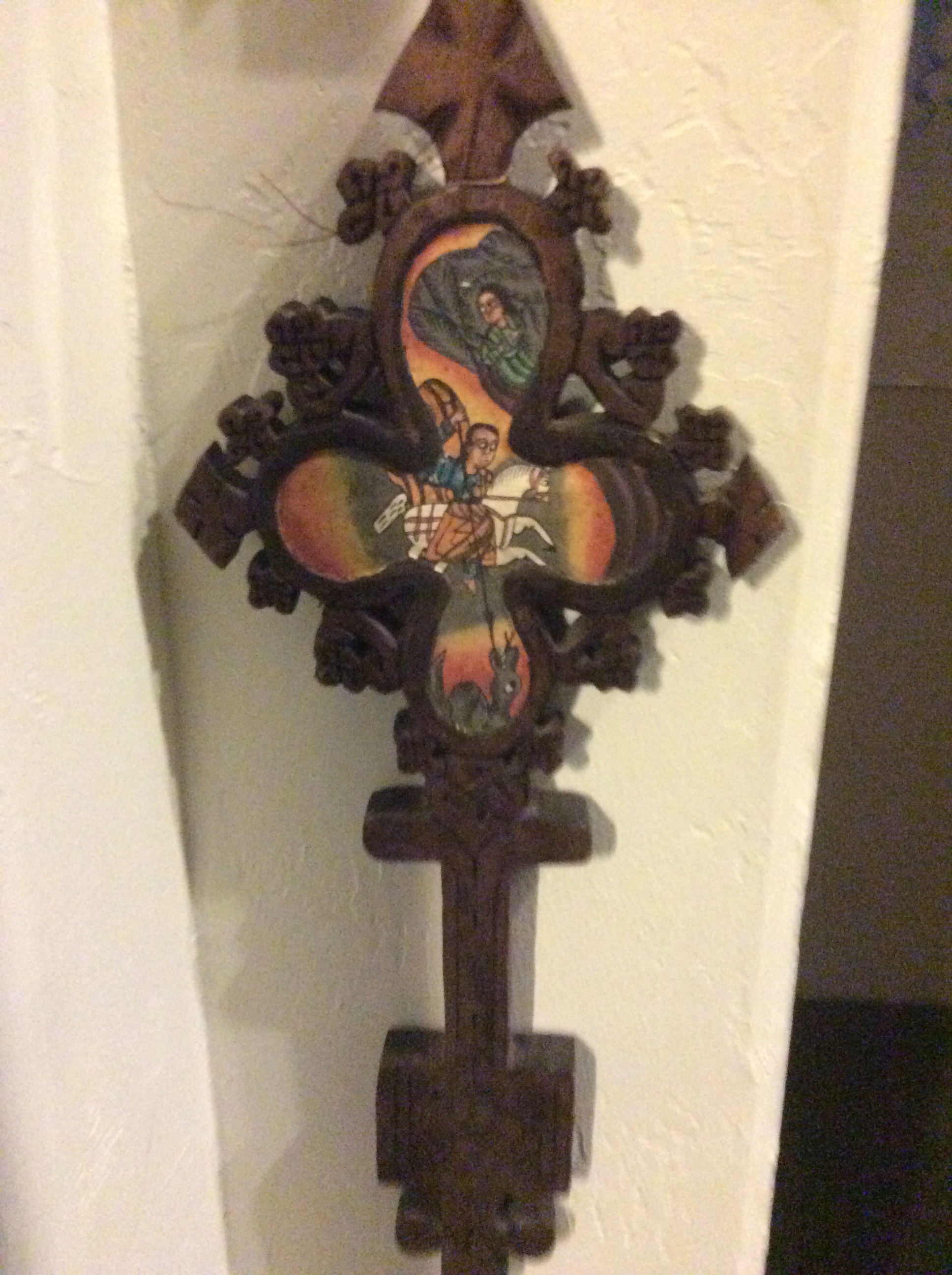 There were two shops in the village that sold sacred objects and souvenirs.  I bought this cross which has St. George and the Dragon on one side and the Virgin Mary and baby Jesus on the other.  Mary is exceedingly important in the Ethiopian Orthodox Church.