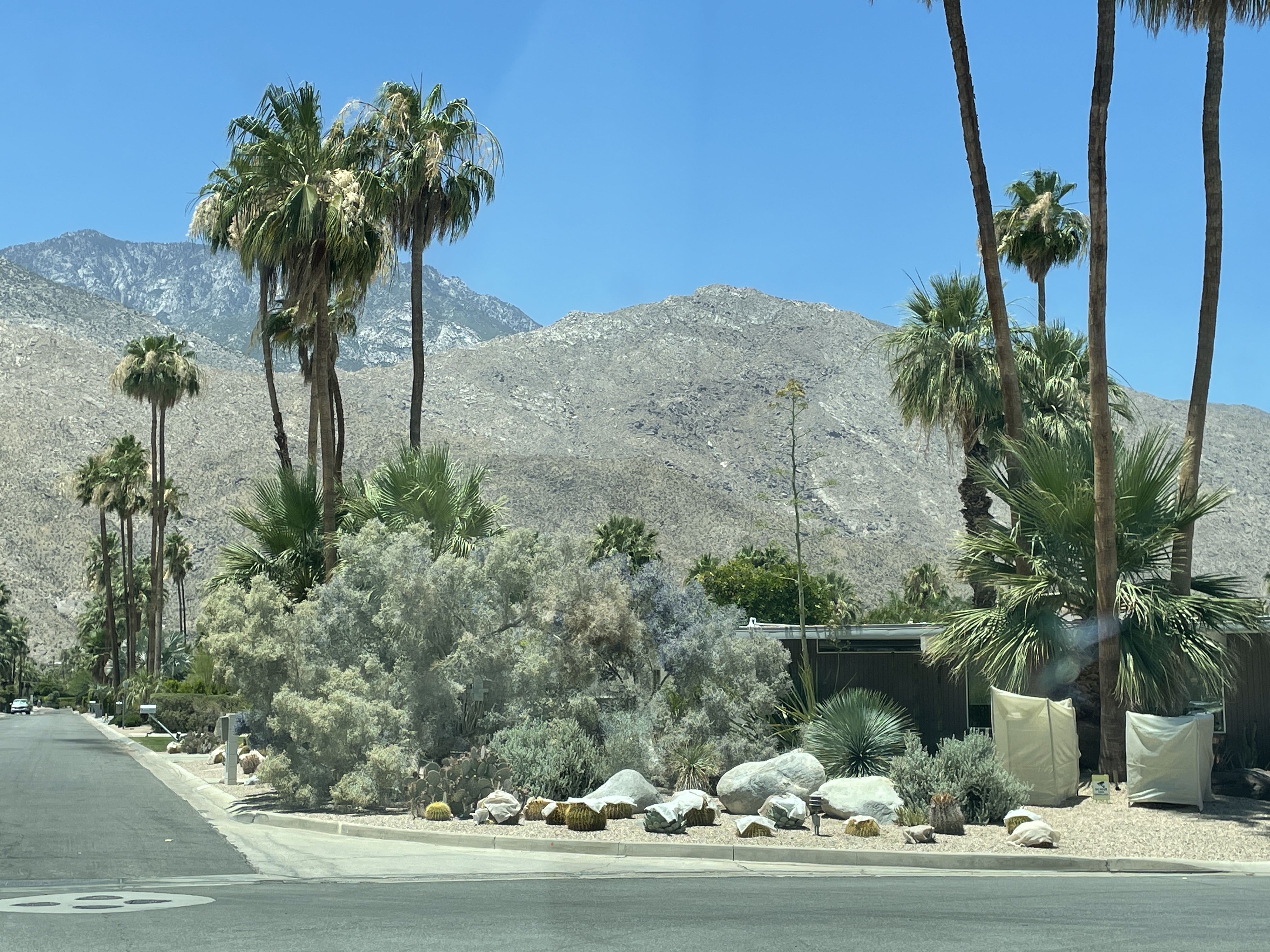 Desert mountains surround Palm Springs. It is hot compared to where I live. When I returned to my car after lunch, the thermometer said 121. It really was not quite that hot, only 103. 1.25 hours later when I arrived back home, it was 87 at my house.