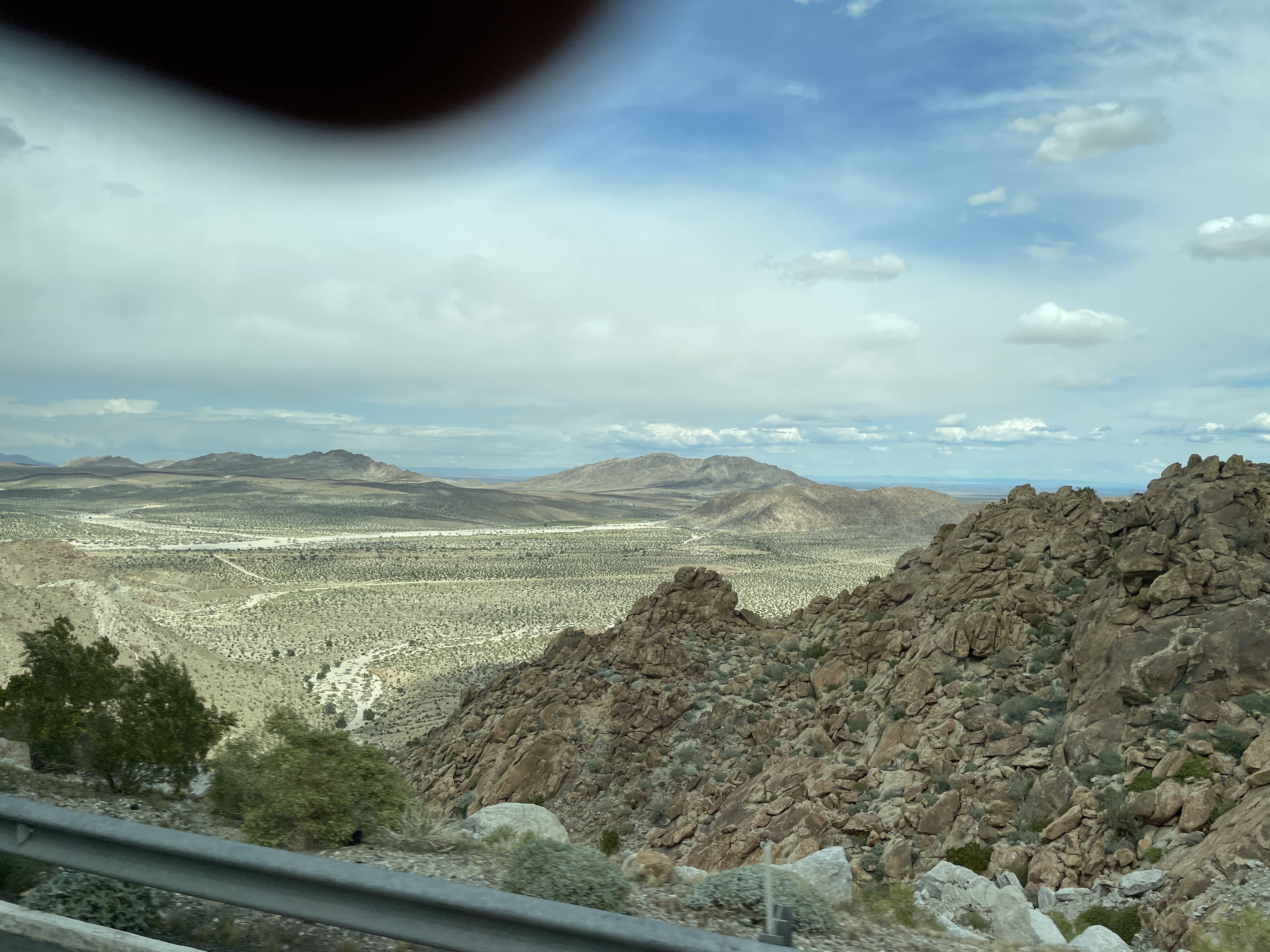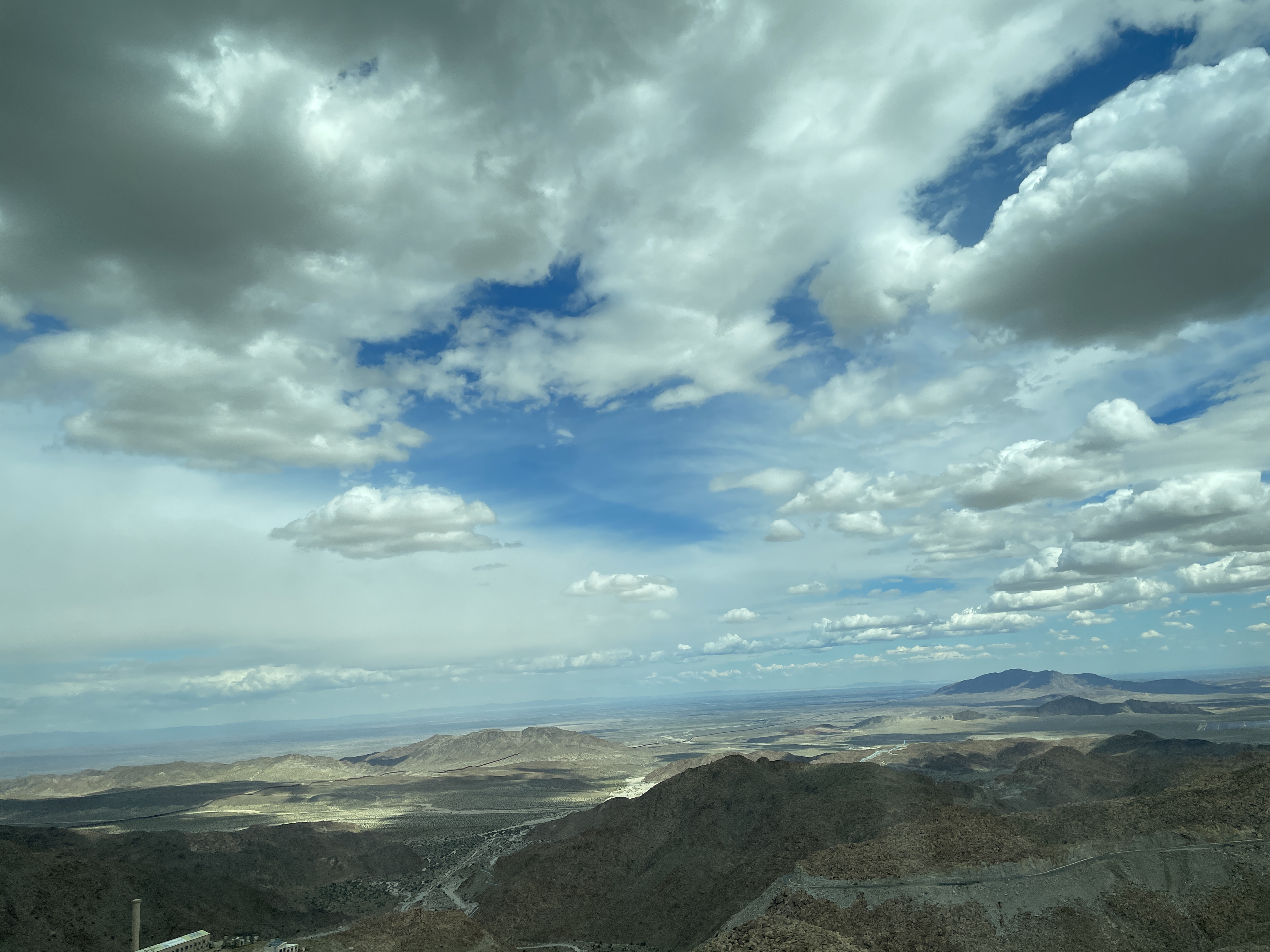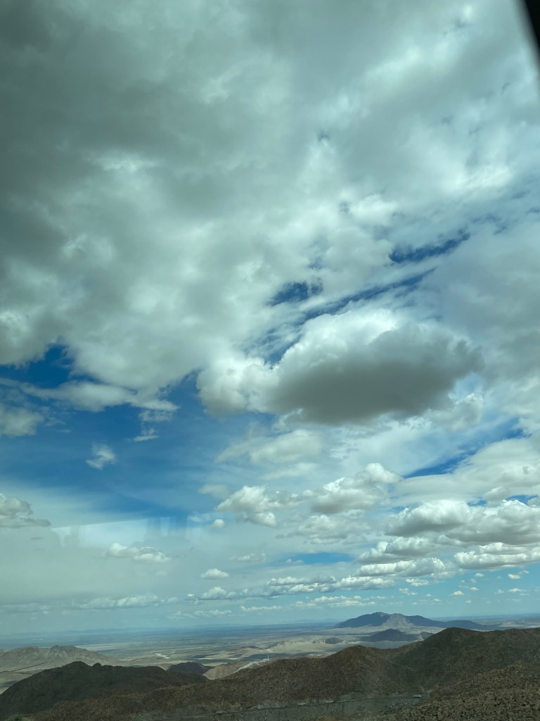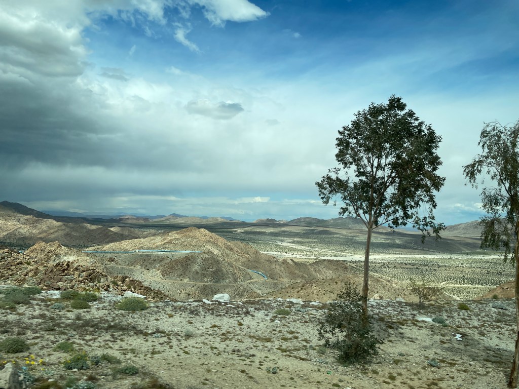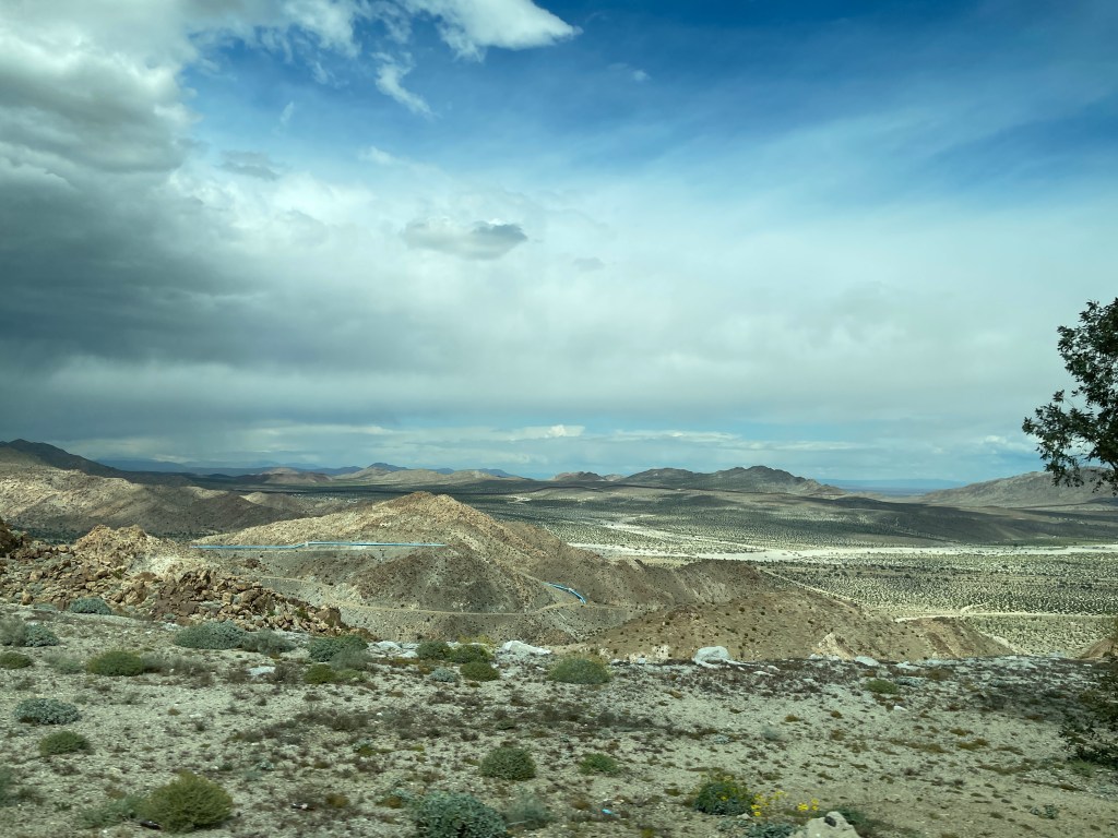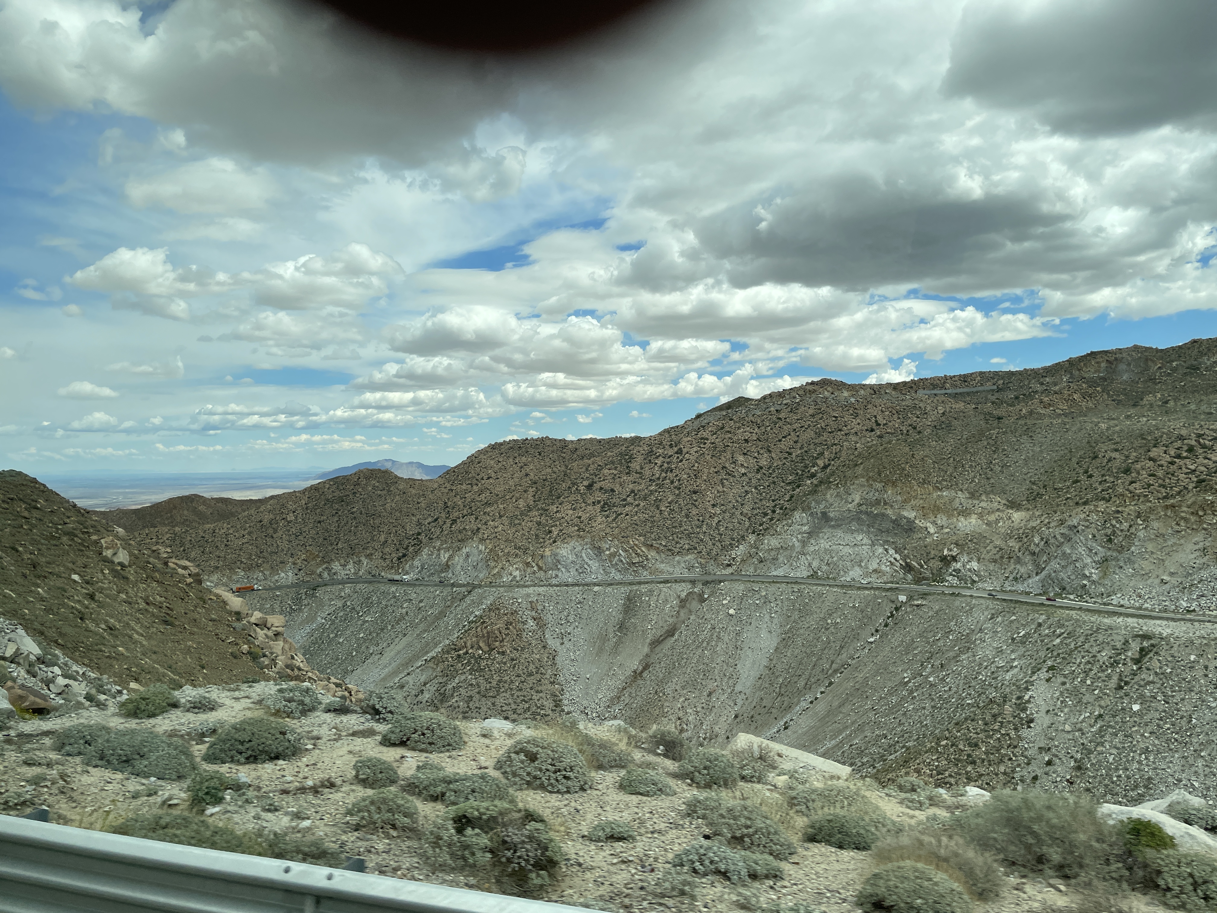 Monday was a big adventure trying to cross the border. We arrived in Mexicali only to discover no busses could cross the border there so we had to take the highway to Tijuana and cross there. To do this you must cross a mountain pass. What a feat of engineering building this road must have been. It is quite incredible and as you climb higher and higher the views go on forever into the far distance. The following are photos I took from the bus window as we drove higher and higher.