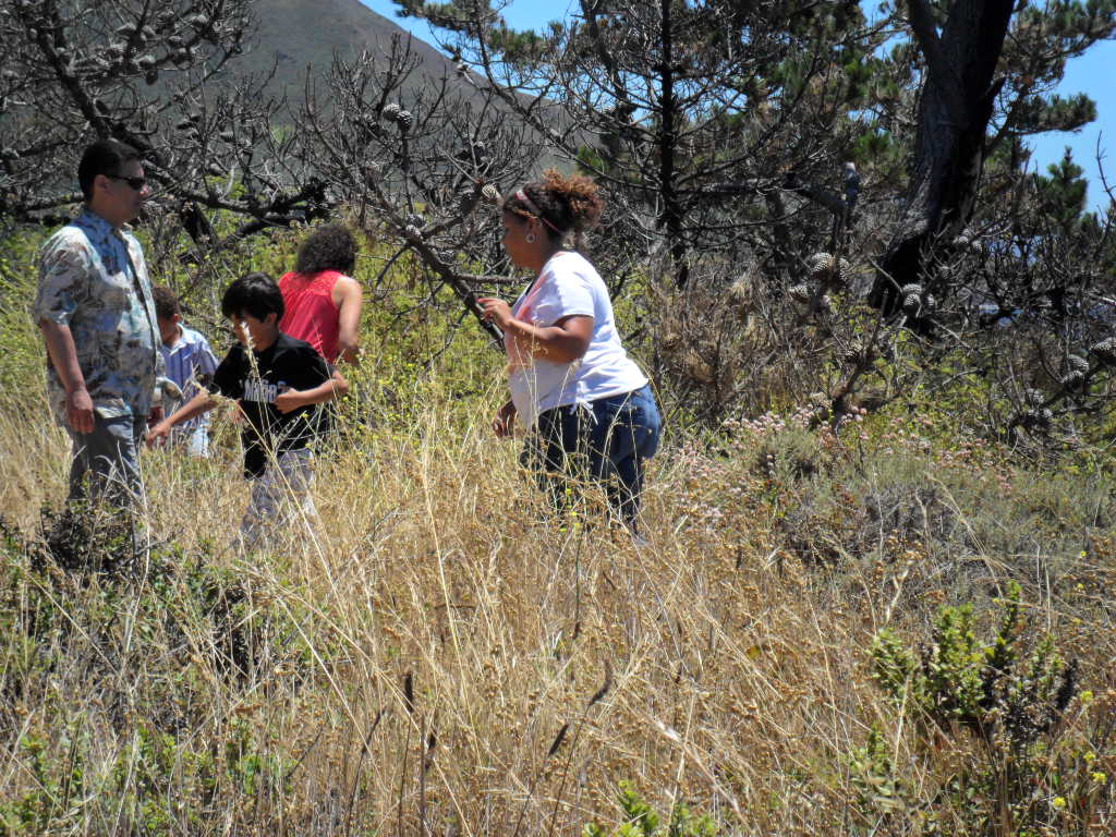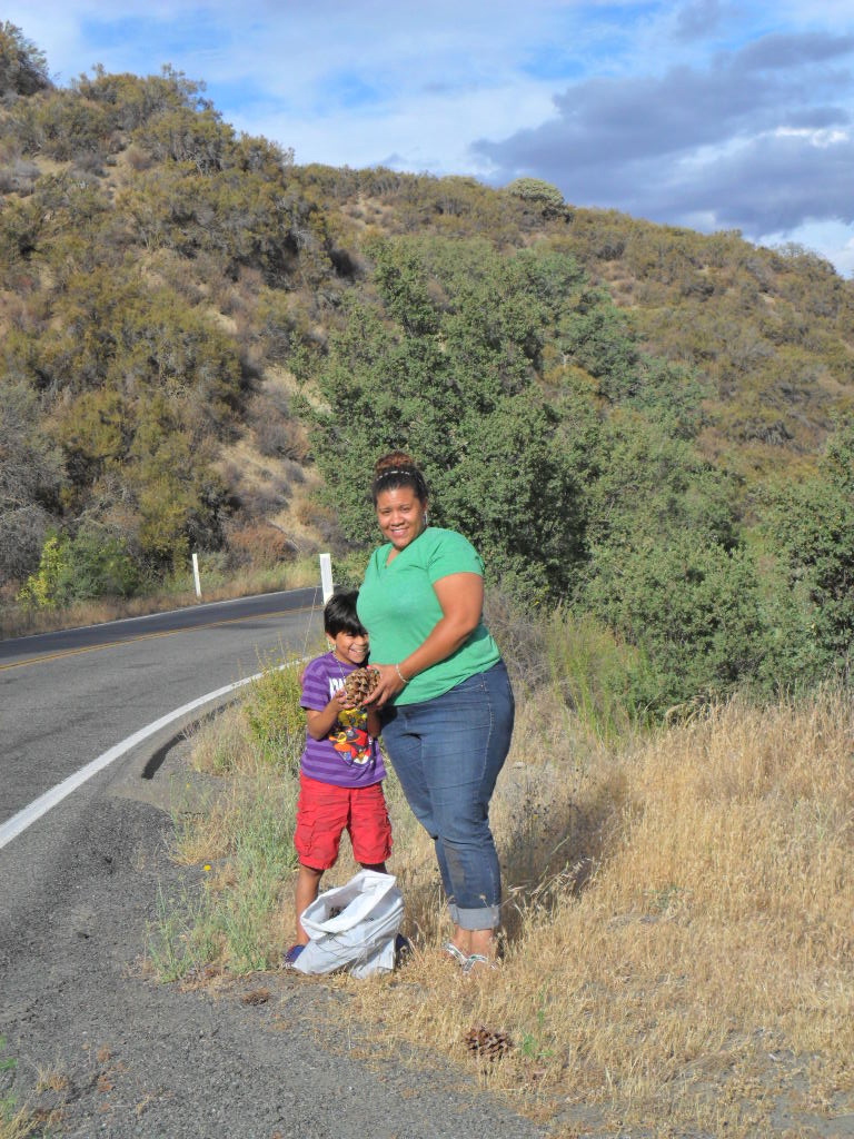 Then, in an hour or less, we were driving across the Central Valley past miles of vegetables and at least three types of trees in huge orchards or groves. The only tree species I was able to identify was almonds. I wanted to take pictures, but did not desire to arrive in Carmel at my college roommate’s house in the dark so I kept driving. No quick road exists that crosses California except way to the south. This still astonishes me. Two lanes with heavy truck traffic take a long time to get from one destination to another. We decided to cross on 198 through Coalinga to San Lucas which resulted in a fun, scenic drive with lots of twists and turns. Much to our surprise, huge pine cones lay everywhere beside the road. It seemed strange that these cones came from a tree much smaller than the Sequoia. Ema and D’mitri collected some to display at home.