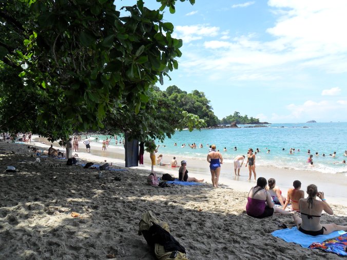To get into Manuel Antonio you have to walk and no parking exists really close.  Hiking out we crossed an area where the water rushed around our knees and the sign said, “No Swimming, Crocodiles”.